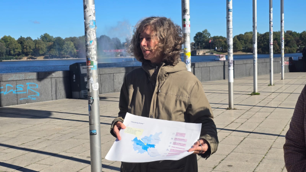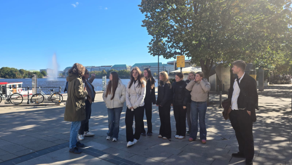 Nach dem Vortrag führte uns Dr. Daniela Leitner von der Innenstadtkoordination Hamburg über den Jungfernstieg. Sie erklärte, wie die Stadt den Verkehr in der Innenstadt beruhigt – zum Beispiel durch Straßen, die nur von Bussen befahren werden dürfen, oder durch den Umbau von vierspurigen zu zweispurigen Straßen. So entsteht mehr Raum für Menschen, die zu Fuß oder mit dem Rad unterwegs sind. Der Rundgang machte deutlich, wie sichtbar sich Hamburg auf den Weg zu einer klimafreundlichen und zukunftsfähigen Stadt macht.