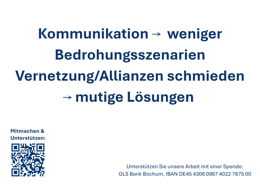 Neuneck unterstrich die Notwendigkeit globaler Zusammenarbeit, verwies auf die Tradition der Pugwash Conferences und forderte, Klima, Biodiversität und Aufrüstung nicht gegeneinander auszuspielen. Der Globale Süden müsse stärker einbezogen, internationale Institutionen gestärkt werden.