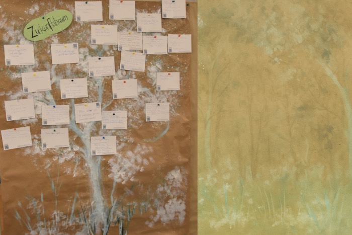 Anhand eines symbolischen „Zukunftsbaums“ wurde überlegt, welche Ideen und konkreten Schritte notwendig sind, um eine lebenswerte Zukunft zu gestalten. Auf vorbereiteten Karten sammelten die Teilnehmenden kreative Ansätze und Impulse für gemeinsames Handeln.
