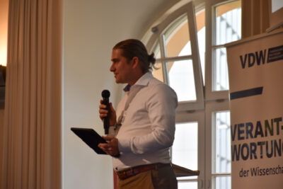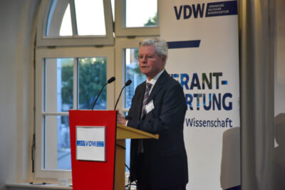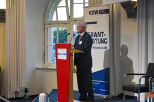 Nach der Kaffeepause eröffnete VDW-Vorstandsvorsitzender Prof. Dr. Götz Neuneck die zweite Hälfte der Tagung mit einem klaren Appell: Wissen trägt Verantwortung. Seit 1959 versteht sich die VDW als interdisziplinäres Netzwerk, das wissenschaftliche Erkenntnisse in gesellschaftliche Verantwortung übersetzt – unabhängig, kritisch, zukunftsorientiert. Wissenschaft könne durch kleine Beiträge große Wirkung entfalten.