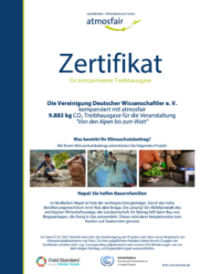 Um Nachhaltigkeit nicht nur zukünftig zu erreichen, sondern auch mit der Veranstaltung einen Teil dazu beizutragen, hat atmosfair die entstandenen Co2 Treibhausgase der Veranstaltung vollständig kompensiert. Dafür wurde ein Klimaschutzprogramm in Nepal unterstützt.