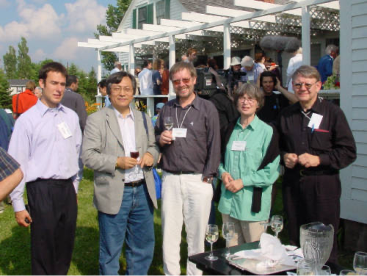Teilnehmer der deutschen Delegation bei der Pugwash Jahrestagung 2003 vor dem Haus, in dem 1957 das erste Pugwash-Treffen im kleinen Fischerdorf Pugwash/Nova Scotia stattfand. Von links nach rechts: Moritz Riede, Mark Suh (Südkorea), Peter und Kathryn Nixdorff sowie Götz Neuneck